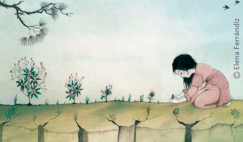 ¿Qué dirías que tienen de característico tus ilustraciones para este proyecto? ¿Qué hay de diferente respecto a otros libros? «Con mis ilustraciones intento que los lectores se sientan identificados con el personaje. Mis ilustraciones están llenas de metáforas visuales. Siempre tengo la misma necesidad de construir imágenes que sean conceptuales y que lleguen a la emoción. Quizá en este libro sean más directas, pero a la vez también más delicadas, más poéticas. Cada proyecto nuevo es una posibilidad para experimentar y también una evolución. El dibujo en este álbum es más preciso, más definido y aquí he utilizado algunos primeros planos más detallados, más realistas y la naturaleza también adquiere mucha presencia en los dibujos».