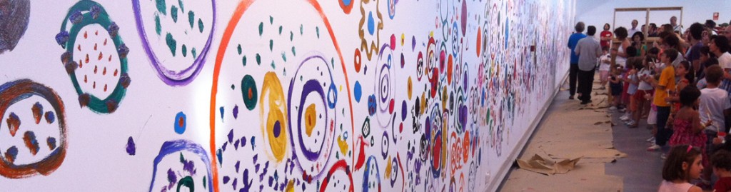 ¡La pared es nuestra! Esto decía el título del taller que protagonizaba Hervé Tullet dentro de Ilustratour Familiar y eso es precisamente lo que ha pasado. Los asistentes al taller, niños y niñas pequeños, y niños y niñas grandes, se lo han pasado en grande.