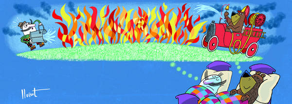 “Actualmente casi todo se hace con ordenador y los libros de Antonino no son una excepción. Sin embargo, el dibujo lo hago a lápiz sobre papel y procuro conservar este trazo del lápiz que le da una vida especial al dibujo. El ordenador lo utilizo sólo para el color, usándolo lo más pictóricamente posible, intentando evitar todos estos trucos típicos de la ilustración informatizada que acaban uniformando demasiado los estilos. Me planteo los trabajos como cuando los colores iban indicados a la imprenta. Me gustan mucho las ediciones de los libros antiguos, de cómo aquellos artistas sacaban tanto provecho de tantas limitaciones técnicas que había entonces. Añoro un poco la época en que se pintaba a pincel. Entonces más que trabajar hacía una meditación Zen, aquellas horas que vivía con los olores de la pintura y de las tintas, el sonido de la plumilla o del pincel sobre el papel, un mundo más ‘matérico’ y a la vez muy espiritual, dándote el lujo de tener la mente en blanco y dedicarte a observar cómo la mano se movía sobre el papel y aparecían colores como por arte de magia. Me resulta fácil imaginarme un monje Zen meditando haciendo trazos de tinta con su pincel en la mano, en cambio me resulta imposible visualizar el mismo monje meditando tocando las teclas de un ordenador”.