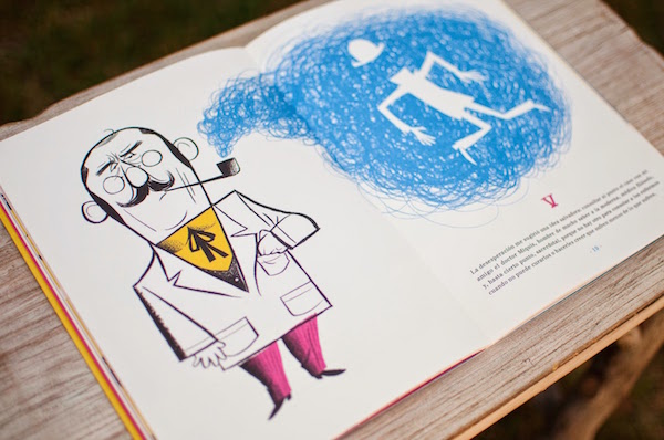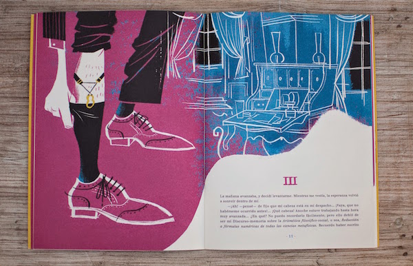 Sobre las ilustraciones, ¿hay algo nuevo o distinto respecto a otros trabajos? «Distinto no, porque estoy acostumbrado a limitarme la paleta de colores para trabajar, es un truco que me ayuda mucho a enfocar las ilustraciones. Nuevo sí, porque ha sido la primera vez que he trabajado sin bocetos previos, sin lápiz, tenía una vaga idea de qué quería dibujar en cada página y me lancé al ruedo directamente, cosa que no suelo hacer nunca, mi proceso de trabajo siempre había sido muy lento, reflexivo y basado en la repetición».