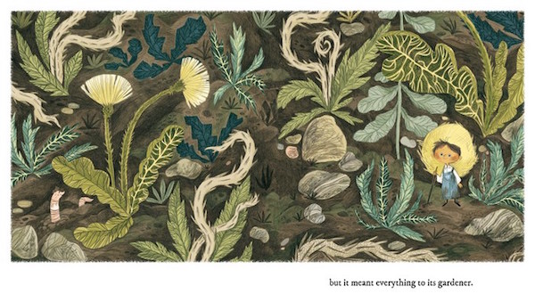 “El texto, cómo es un problema siempre. No se me da muy bien colocar el texto junto a las ilustraciones, me considero tímida en ese sentido y busco un estilo condensado en el texto, en los diálogos, para no poner algo ahí que me haga sentir incómoda. No quiero que el texto comprometa a las imágenes… En el jardinero conseguí que las imágenes fueran seguidas de esos pie de texto de una manera bastante armónica”.