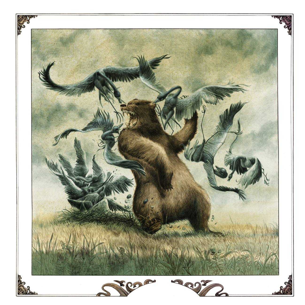 ¿Cuál es tu ilustración favorita de este proyecto? ¿Por qué? “Debe ser el oso y las grullas. Creo que fue el primer boceto que hice y se lo envié a Ellen. Fue con este dibujo con lo que comenzó todo y también porque me gusta la composición”.