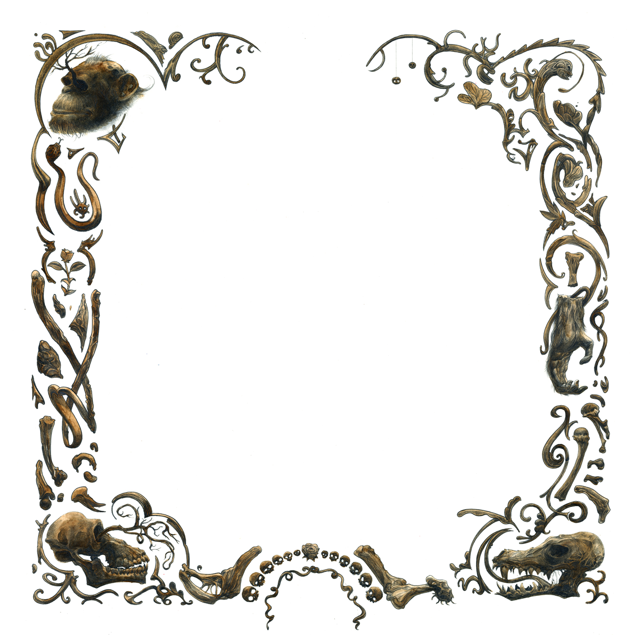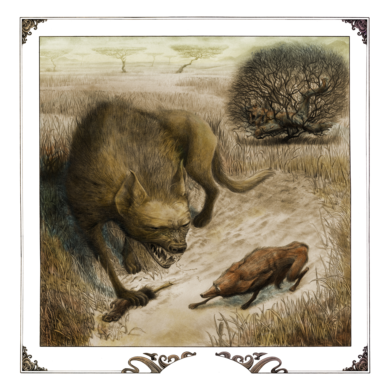 Cuéntanos algo sobre las ilustraciones. “Las ilustraciones representan escenas con dos o más animales, no necesariamente del mismo continente o hábitat, que representa una escena -nos cuenta Kristian Eskild Jensen-. Elegimos los animales al azar. Algunos porque encajan en una historia y otros porque eran particularmente hermosos o interesantes de dibujar. La inspiración vino de artistas como Gustave Doré y otros de esa época”. ¿Con qué técnica están realizadas las ilustraciones? “La técnica es a base de lápiz, carbón y acuarela. Luego lo terminé en Photoshop, manipulando los colores. Hice muchos estudios de los animales, pero traté de extraer de la memoria en el proceso de finalización para poner el carácter en los animales y hacerlo más personal y no necesariamente anatómicamente correcto”.
